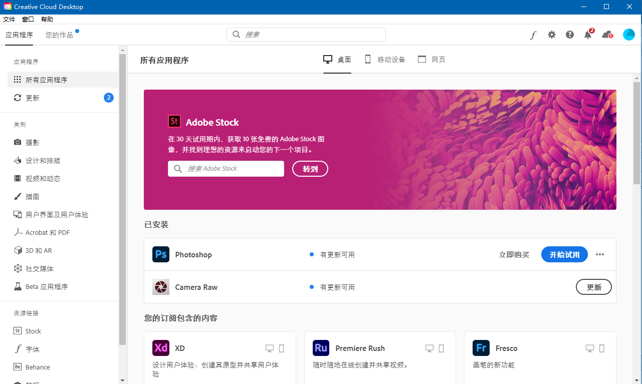 Adobe Creative Cloud客户端来自Adobe旗下一款专门为Adobe旗下所有的软件而服务的专属套装应用,Adobe Creative Cloud客户端可以随时管理Adobe旗下系列软件和相关软件衍生的资源管理,Adobe Creative Cloud作为Adobe软件桌面程序可以开启Adobe全家桶。