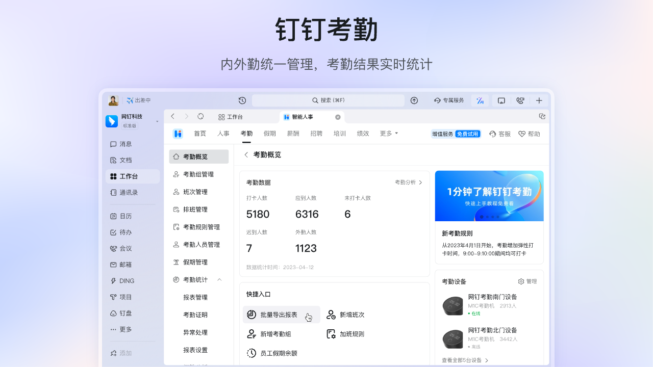 考勤统计与异常提醒:提供考勤统计报表,方便管理者查看员工的考勤情况,如出勤天数、迟到早退次数、加班时长等。同时,系统会自动检测考勤异常情况,并发送通知提醒员工和管理者,及时处理考勤问题。