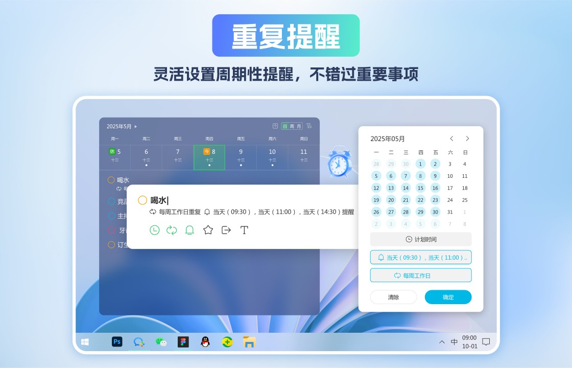 时间管理的核心之一就是确保重要的事情不会被遗忘,这款软件的全能提醒功能就像是你的私人闹钟,时刻为你守护重要事项。它支持按照天、周、月等不同的时间周期随心设置提醒。你可以根据任务的性质和紧急程度,为每天需要完成的日常任务设置每天提醒,如每日的健身打卡、吃药提醒;对于每周一次的例会、课程,可以设置为周提醒;对于每月的账单还款、重要纪念日等,则设置为月提醒。而且,软件还具备重复设置功能,对于那些需要周期性完成的任务,无需每次都重新设置提醒,软件会自动按照你设定的周期重复提醒,真正做到 “一次设置,长期无忧”,确保你不会错过任何一个重要的时间节点。