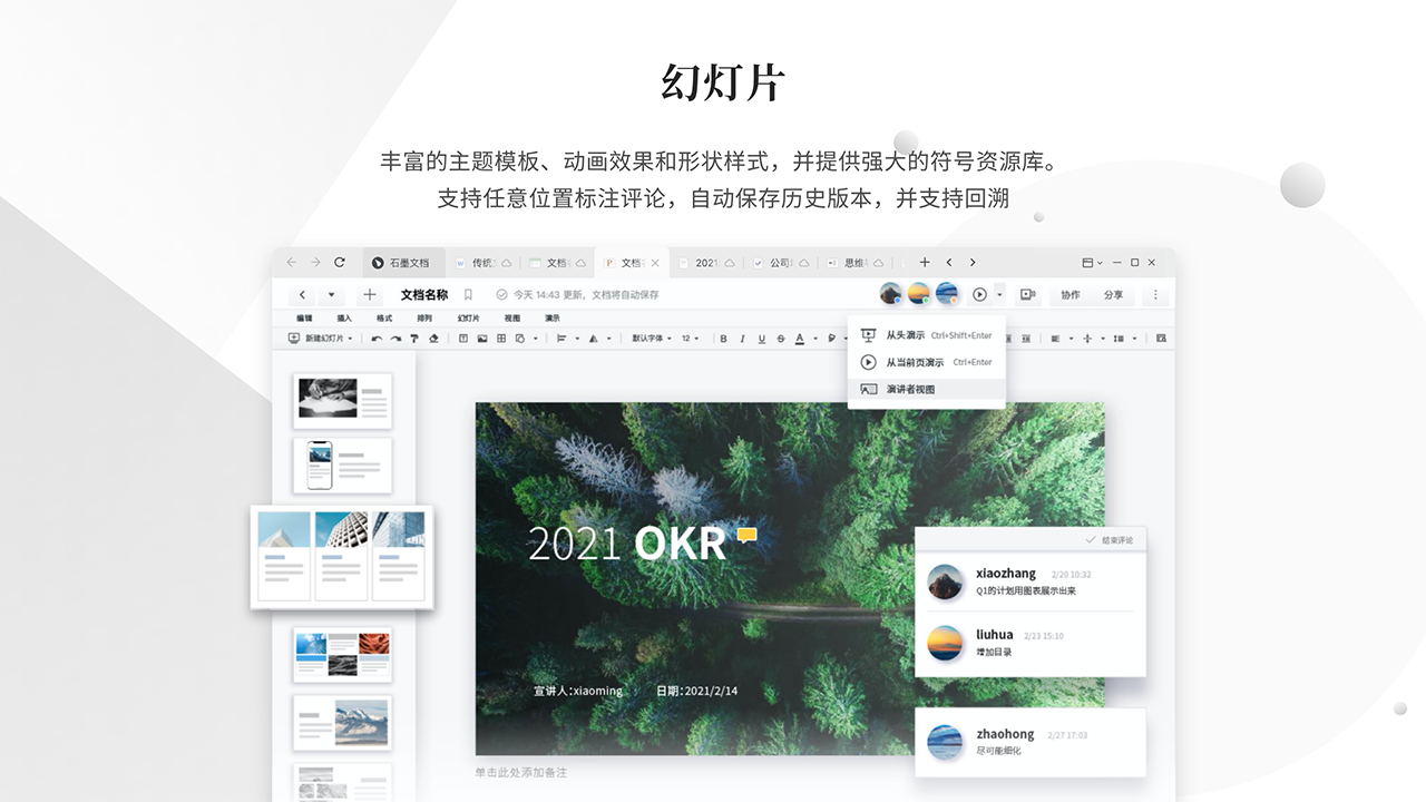 石墨文档电脑版作为一款好用的在线协作云平台,石墨文档电脑版支持九大产品的在线云协作功能,包括表格、文档、幻灯片、思维导图、协作白板等诸多产品的在线多终端同步协作。石墨文档电脑版在线协作表格支持六大函数和数百个公式的在线支持,可以为不同的开发者和使用者提供不同的功能支持和在线协同。石墨文档电脑版还有强大的PPT在线协作功能,石墨文档电脑版拥有丰富的主题模板、动画效果和形状样式多人多端同步协作编辑,支持任意位置标注评论,自动保存历史版本,支持回溯远程 & 本地演示、演讲者 & 普通视图随心切换,配合激光笔与计时器,你将带来一场更打动人的讲演。