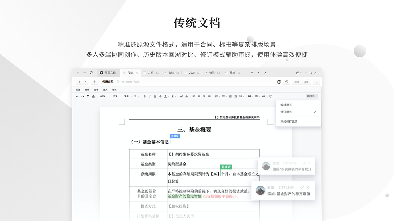 自动保存历史版本与一键还原:所有的编辑历史都会自动保存,用户可以在任何时候追溯查看文档的历史版本,清晰地了解文档的修改过程和内容变化。此外,用户还可以一键还原到任意一个历史版本,这对于文档的修订和回溯工作非常方便,有效避免了因误操作或错误修改而丢失重要信息的风险。