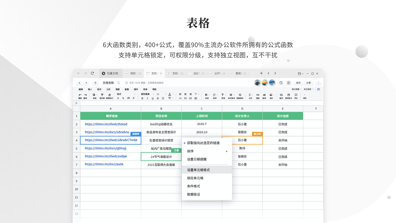 强大的表格应用功能:石墨文档的表格功能完美兼容本地 Excel,导入导出过程流畅,不会出现格式混乱的问题。它支持多人协同编辑、表单表格数据互通,并且拥有 400 多种函数公式和 18 种类型图表,可实现数据的收集、分析、呈现全流程的高效快捷,适用于工作计划、任务清单、项目管理等各种工作场景,为用户处理表格数据提供了强大的支持。
