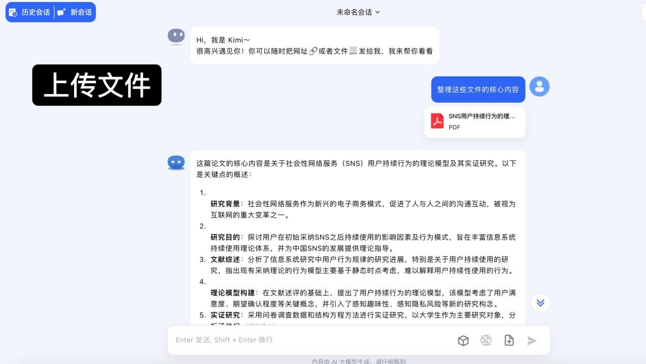 文件摘要:Kimi可以自动提取文件的主要内容,生成简短的摘要,方便用户快速了解文件重点。