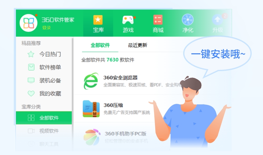 一键安装:360软件宝库支持一键安装功能,用户设定安装目录后,软件可以自动进行安装,无需用户手动操作,特别适合多个软件的无人看守安装。