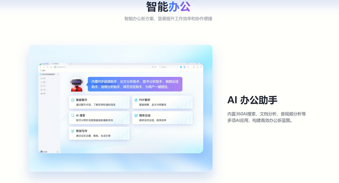 内置 360AI 搜索功能,能够精准、快速地检索各类信息,为办公决策提供有力的数据支持与知识储备。同时,涵盖文档分析、音视频分析等多项前沿 AI 应用,可深度剖析文档内容,提取关键信息,对音视频进行智能识别与解析,例如自动生成会议纪要、从视频培训资料中提取要点等,从而构建起高效办公的全新蓝图,极大地提升了工作效率与质量,助力企业在数字化时代抢占先机。