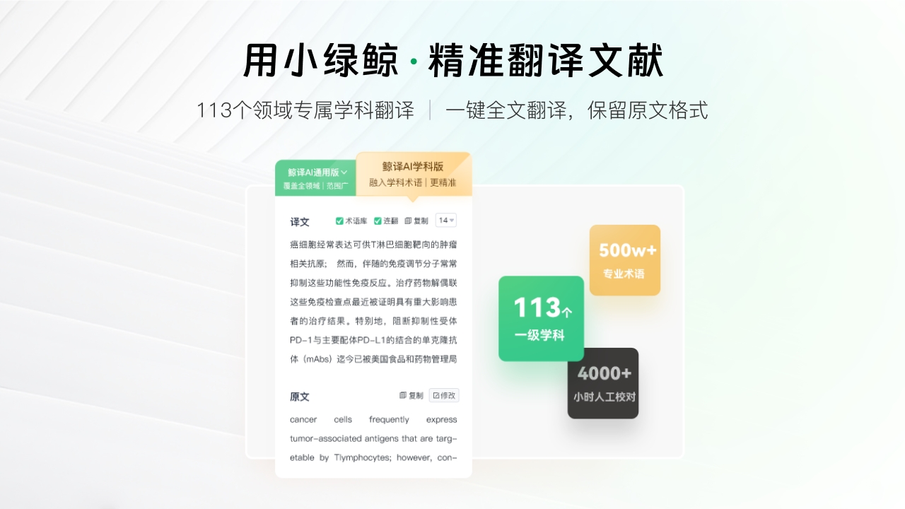 小绿鲸英文翻译阅读器支持选题、做实验、写论文、组会汇报等10+种文献阅读场景设计了专业的解决方案;,支持平板端、网页端、客户端3端同步使用,学习数据实时同步。真正做到随时随地、高效阅读文献,从各个环节提高科研工作效率。