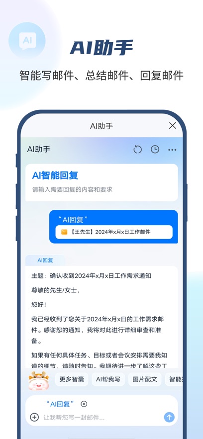 创新性地增添了 AI 智能撰写邮件、AI 精准总结邮件以及 AI 智能回复邮件等一系列前沿功能,深度融合人工智能技术与办公流程,为用户精心打造智能、高效且便捷的全新办公模式,极大地提升了办公效率与质量,开启智能办公新时代。