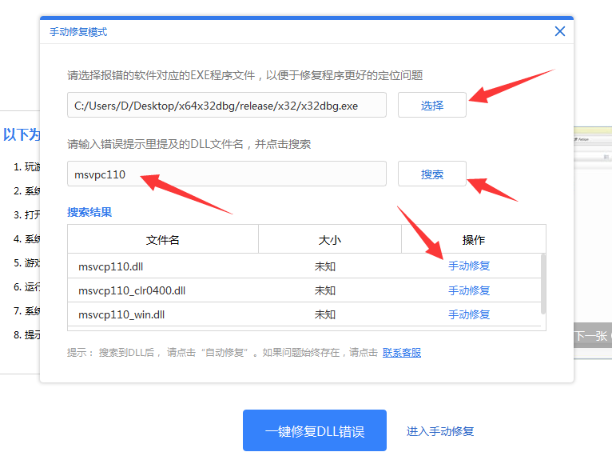 当自动修复功能未能成功修复DLL报错时,请使用手动修复功能,搜索报错的DLL文件,然后点击手动修复。