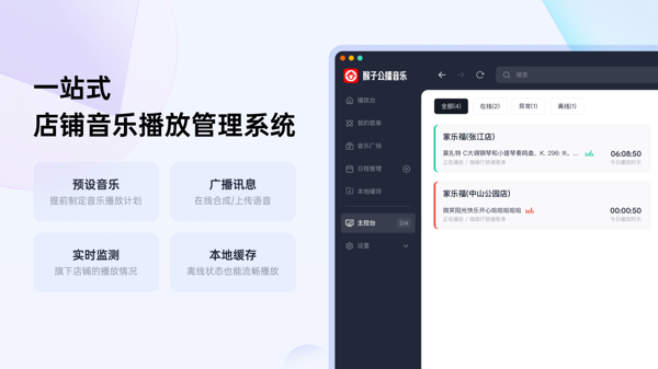 猴子公播音乐适用于商店、餐厅等多种场景,能够让用户自由设计使用,海量优质歌曲歌单在线创建收藏,还内置了不同风格的播放收听模式可以体验,让用户收听到更多更优质的歌曲。