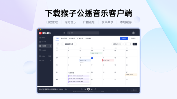精准智能定时播放机制:充分考虑到不同场所的经营时间与活动安排差异,猴子公播音乐软件为用户贴心地配备了智能定时播放功能。借助这一功能,用户能够依据自身所处场景的独特需求,极为便捷地对音乐的播放起始时间与结束时间进行细致设定,从而实现音乐播放的全自动化操控,彻底摆脱手动操作的繁琐与不便。