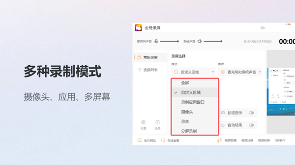 金舟录屏大师免费版是一款备受欢迎的屏幕录制工具,只需一点即可进行录制,并且画质分辨率可以根据自己所需进行调整设置,金舟录屏大师2025最新版可以让用户自行录制特定区域,支持通过摄像头进行视频录制,可以进行面对面进行教学演示内容。