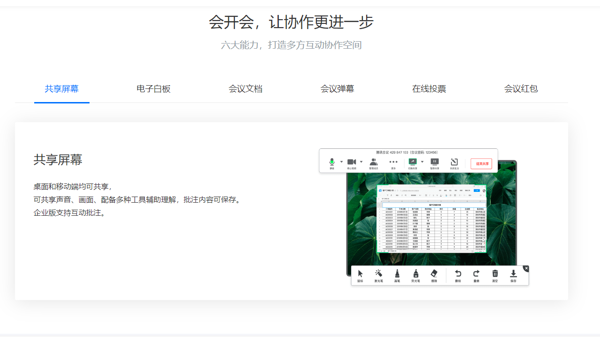 腾讯会议支持会议屏幕共享,能够让其他使用者快速了解最新的工作进展,支持在多个场景中适用,帮助用户轻松突破时间和地域的限制,进行高效的远程沟通。