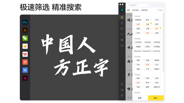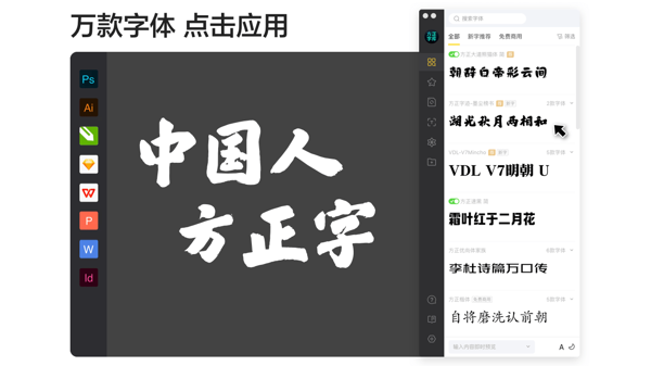 免安装一键激活,多软件适配无忧:方正字库客户端贴心关照主流设计、办公、图文排版软件,PS、AI、PDF、PPT、Sketch、CDR 等文件格式均能智能检测。