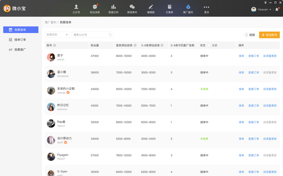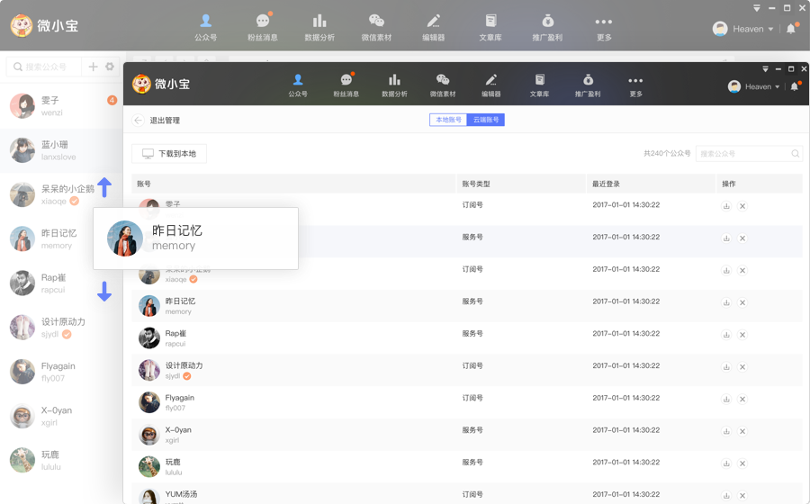 微小宝是一款好用的微信公众号管理软件,微小宝电脑版有着最强的微信公众号管理功能,在这里只需要导入公众号,就可以直接在该公众号之中发布或者编辑相关内容,并且可以快速统计阅读相关需求。