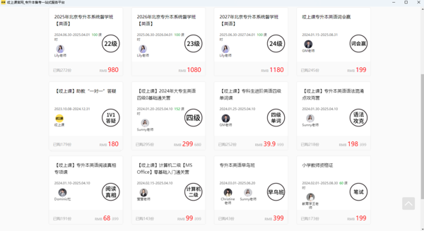 全面的课程体系:覆盖英语、数学、语文等多门公共课以及数十类科目上百专业课程。根据每省份实时考纲设置课程,直抓考点,设有督学班、呵护班、冲刺押题班等多种班型,满足不同考生的需求。