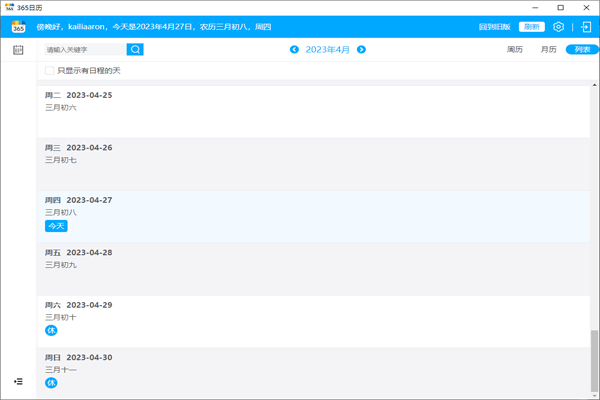 365日历这是一款专业的中文日历软件,目前已经上线快20年,一直持续为广大国内用户们提供日历功能支持。365日历软件,目前已经全方位覆盖所有终端,Web和手机端以及电脑端都可以为您提供强大的日历功能支持。365日历支持公历和农历双重功能,还支持传统中国24节气和各种出行建议等等。按照用户需求还有天气和24小时以及近日天气情况等等,为广大用户们提供提贴心的日历支持。