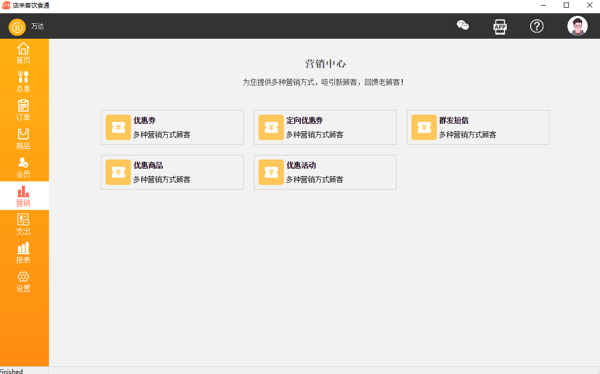 多元化营销工具:内置优惠券、次卡、套餐、满减赠、折扣等多种营销活动方案,可精准推送,刺激消费,主动创收。