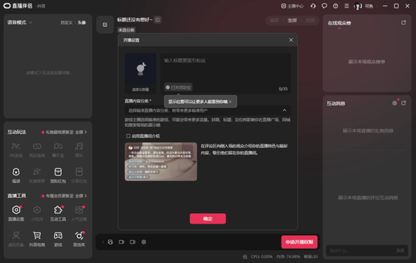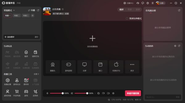 抖音直播伴侣2025最新版是一款专为主播设计的直播辅助软件,这里能够为用户提供更加优质的直播体验和互动效果,抖音直播伴侣电脑版能够让主播在直播过程中切换多个场景,丰富多样的虚拟背景选项,主播可以根据需求选择或自定义背景。