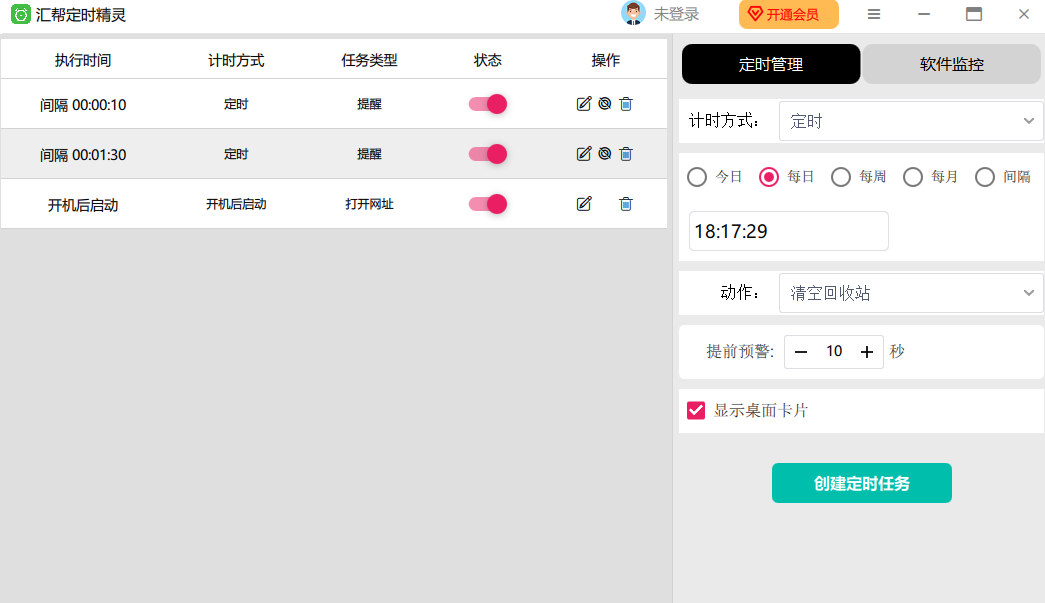 汇帮定时精灵之中有着最简单的自动化功能,可以帮助用户节省时间和能源,确保设备在最佳时机自动运行,软件具有稳定的执行机制,能够按设定的时间精准启动任务,避免任何操作上的延误或失误。