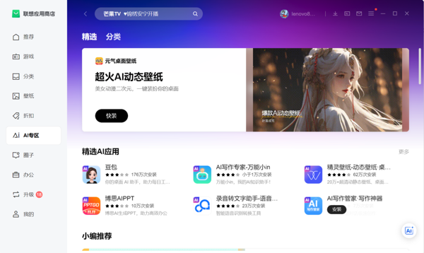 联想应用商店电脑版是一款一站式软件下载平台,联想应用商店PC版提供快速、稳定的软件下载通道,用户可以在短时间内下载所需的软件和游戏,所有上架的软件和游戏都经过人工严格测试,确保应用的安全性和稳定性。