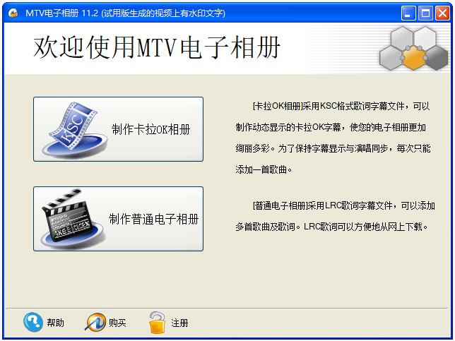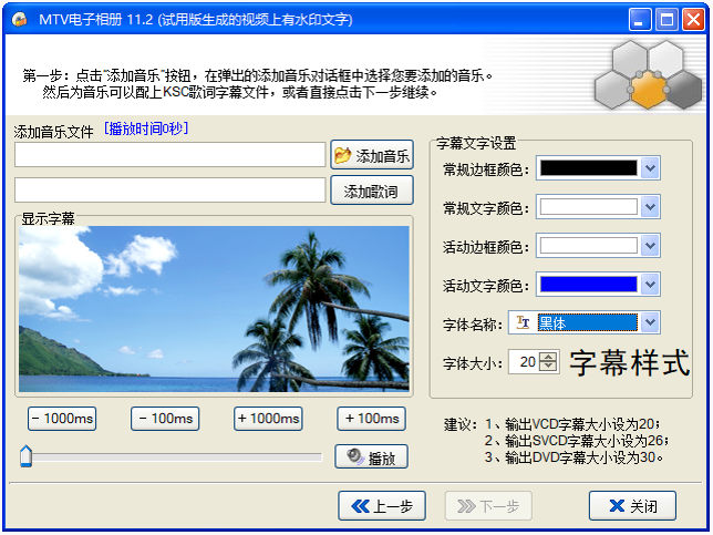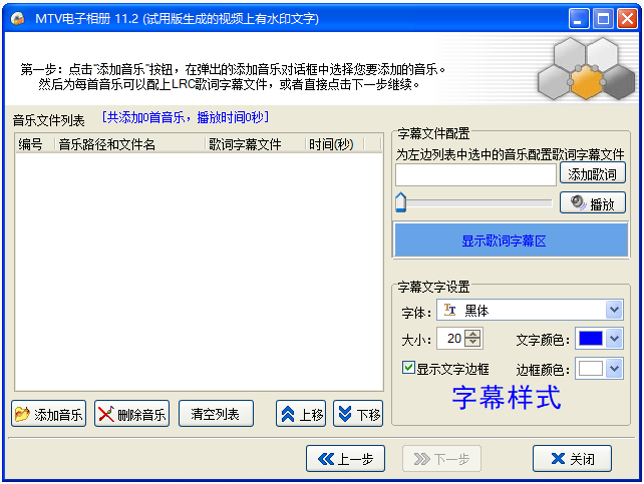 飞华MTV电子相册软件能够为相册添加背景音乐,支持卡拉OK歌词字幕和普通字幕,增加字幕内容和背景图片。