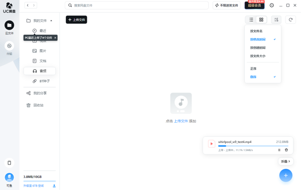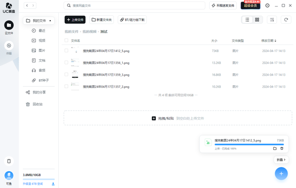 UC网盘软件支持文档、图片、音视频等多种文件格式的存储,方便用户上传不同类型的文件,还支持在线查看内容。