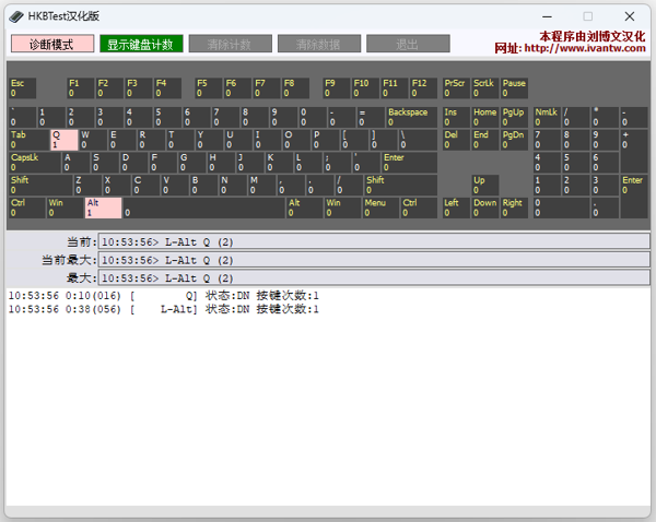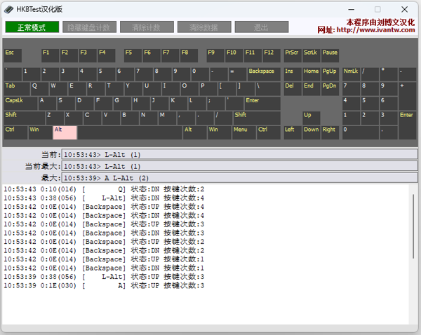 软件通过白色背景窗口,详细呈现按下按键的时间、按键编码、按键名称、按键的状态(按下 | 弹回)以及按下按键的次数等多维度信息。