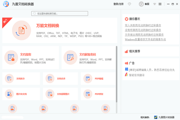 九雷文档转换器电脑版是一款功能强大的文件格式转换工具,九雷文档转换器2025客户端能够将不同格式的文档、表格、演示文稿、图片等多种类型的文件进行相互转换,支持的格式涵盖了常见的办公文件、PDF、图像文件等,满足用户在日常工作中的多种需求。