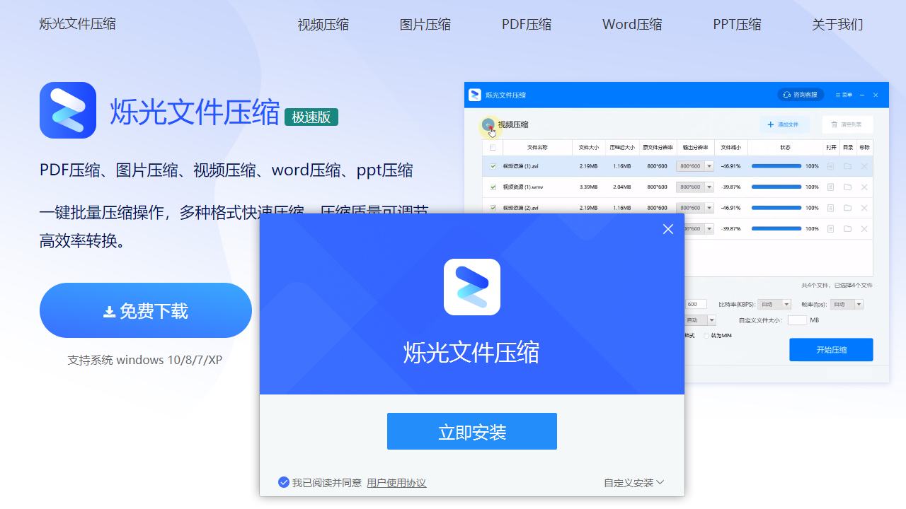支持 PDF、图片、视频、word、ppt 等多种格式文件压缩,满足办公与生活各类需求。