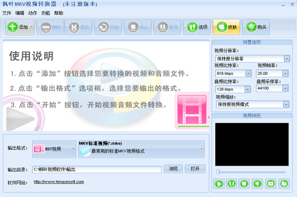 枫叶MKV视频转换器电脑版是一款专业且功能强大的视频转换工具,枫叶MKV视频转换器最新版提供丰富的自定义选项,用户可以调整视频分辨率、帧率、比特率等参数,能将JPG、PNG、GIF等图片格式转换成FLV、SWF网络视频格式,拓展了使用场景。