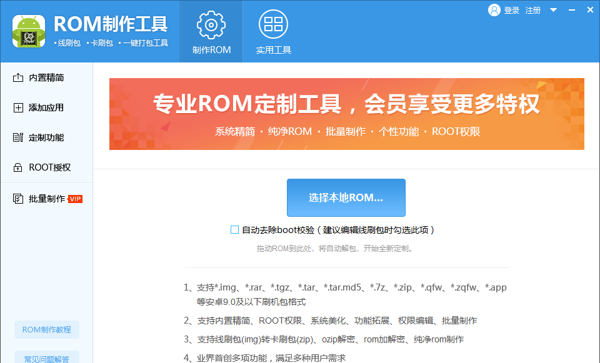ROM制作工具免费版是一款专门创建、编辑和修改的ROM文件的工具,软件支持多种ROM格式,用户的可以将制作的文件在虚拟环境中运行测试,ROM制作工具电脑版支持批量处理ROM文件,可以提高用户股开发和测试效率,界面设计简单,操作功能直观,便于用户进行使用。