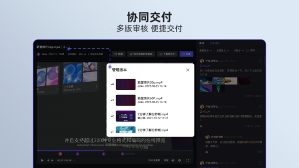 支持多种格式与高清播放:允许超过 200 种专业格式和编码的在线预览,可与团队成员快速共享内容。此外还支持 4K 视频播放,7.1 声道音频波形展示,为内容审阅提供品质保证。