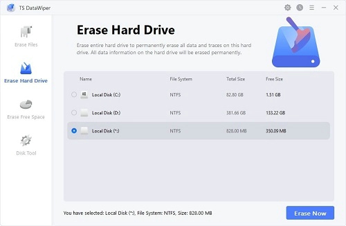 TS DataWiper软件提供多种数据擦除标准,包括快速擦除、全盘擦除及多重擦除模式,用户可以根据不同需求选择适合的擦除方式,以确保数据的彻底销毁,满足各种隐私保护需求。