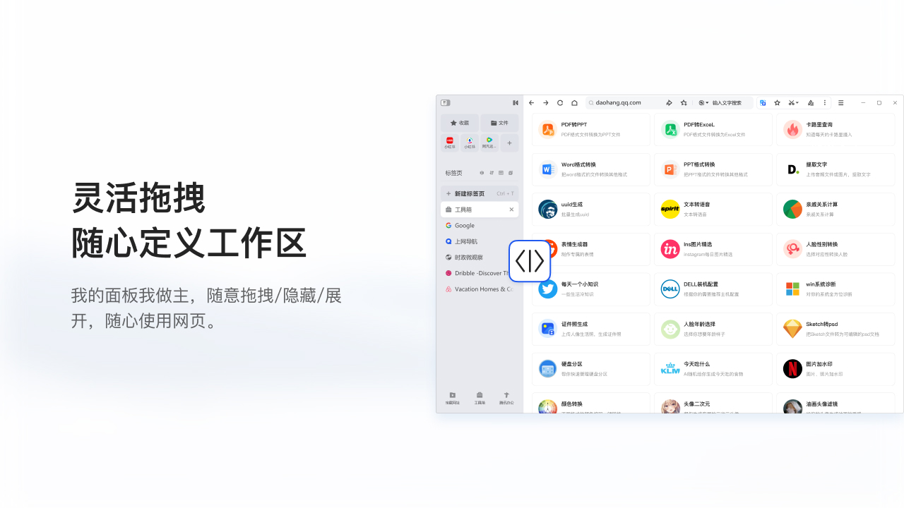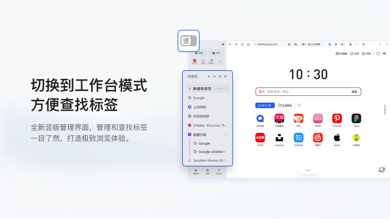 10、「竖版工作台」:提升工作效率,清晰展示所有标签。支持标签自动分组,减少杂乱页面,操作更加直观。