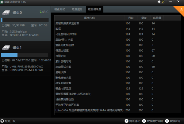 能够全面显示磁盘的温度、厂商、型号、链接情况、使用状况、健康状况(S.M.A.R.T.信息) 等关键数据,让用户对磁盘状态一目了然,如同给磁盘做了一次全面的“体检”。