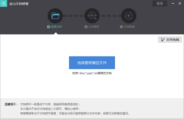 金山文档修复免费版是一款专门用于修复损坏或无法正常打开的文档工具,金山文档修复电脑版能够修复因系统故障、病毒、操作不当等导致的文档损坏,无需人工干预,软件能够自动检测损坏类型并进行修复,提供专业的恢复算法,最大限度地恢复丢失的文本内容、表格、图片、格式等信息。