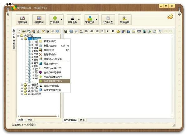 输出格式十分多样,不仅能生成安卓 APK 安装包,还可制作苹果 IPA 安装包(适配越狱设备),同时支持 EPUB、CHM 电子书及 HTML 网页导出。