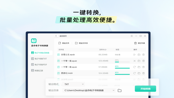 金舟电子书转换器电脑版是一款功能强大的电子书格式转换工具,金舟电子书转换器最新版能够将不同格式的电子书进行快速精准的转换,帮助用户轻松在不同的电子书阅读设备和平台之间转换,方便用户随时随地在线阅读喜欢的书籍资源。
