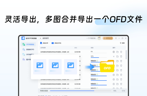 图片合并转 OFD:支持将多张图片合并导出为一个 OFD 文件,方便用户将相关图片整合为 OFD 格式进行存储和分享,在处理图片资料整理等工作时非常实用。