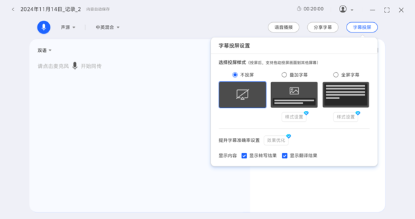讯飞同传软件可以选择将翻译结果以字幕的形式实时展示在屏幕上,方便听不懂目标语言的用户进行跟随。