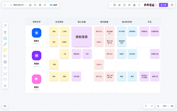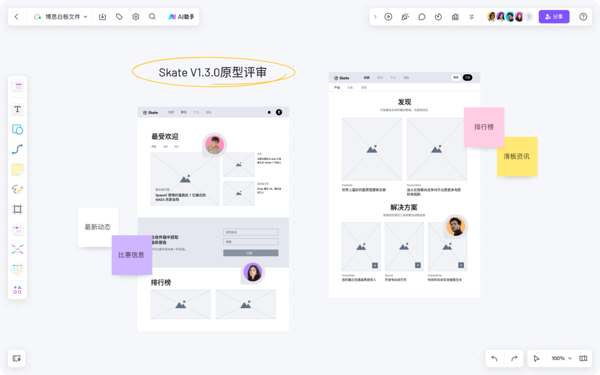 支持多名团队成员同时在同一块画布上进行编辑、评论、绘制,所有人的光标和操作实时可见,仿佛团队围坐在同一块物理白板前。