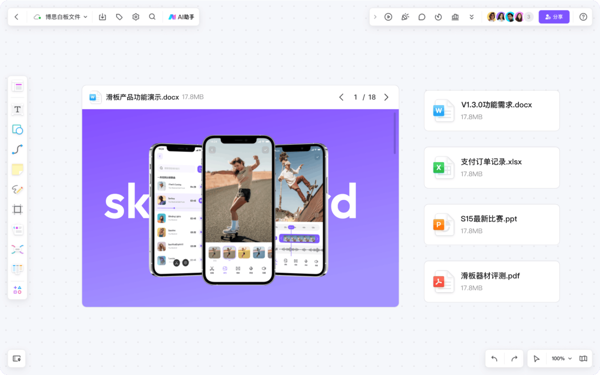 支持嵌入图片、视频、网页链接、甚至第三方文件(如PDF, Word, Excel, PPT) 并将其可视化预览。