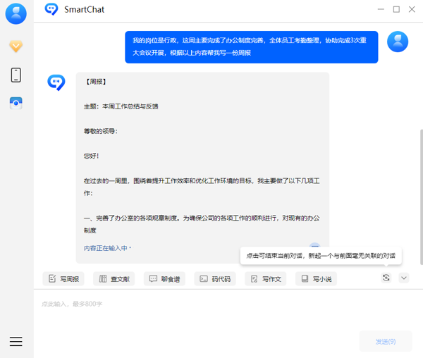 SmartChat智能对话软件可以帮助用户撰写各种文档,如商业计划书、营销策划书、工作周报、作文等,提供精准的结构和创意支持。