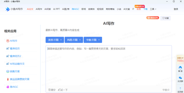 小鱼AI写作免费版是一款Ai人工智能写作辅助工具,小鱼AI写作电脑版能够帮助用户提高写作效率,自动生成高质量文章、视频等,不仅能够生成文章,还能够为用户提供创意写作建议,帮助激发灵感,用户可以根据不同的创意建议调整文章内容,创造更具吸引力的作品。