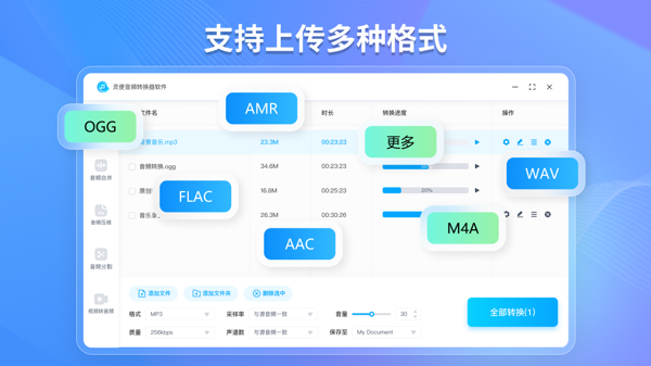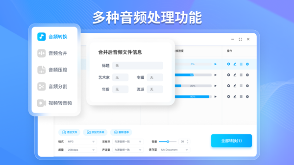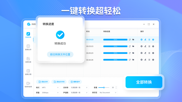 批量处理高效省时:只需鼠标轻轻一拖,海量音频文件就能迅速 “入驻” 软件。批量转换、合并、压缩、分割一气呵成,一次性搞定多个音频任务,极大缩减了处理时长,让碎片化的音频整理工作瞬间变得井然有序。