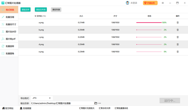 支持对多张图片进行批量压缩、批量格式转换、批量重命名、批量加水印、批量调整尺寸等操作。