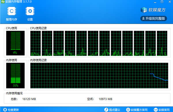 界面直观显示总内存、已用内存、空闲内存及 CPU 使用率,数值清晰易读。无需打开系统设置,就能实时掌握硬件资源状态,判断是否需要整理。