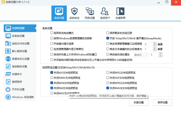 系统设置涉及资源管理器、多系统设置、系统文件夹设置、默认程序设置等内容 。安全设置包括安全综合设置、系统更新、阻止程序运行、系统还原等功能。