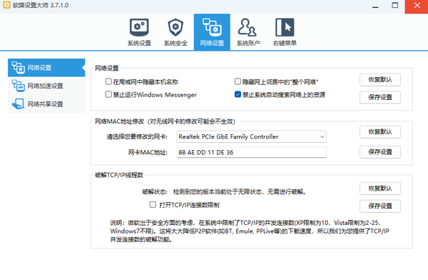 网络设置可进行网络加速设置、网络共享设置、网络 mac 地址修改等 。用户管理能够对用户名、密码、主机号等进行管理。