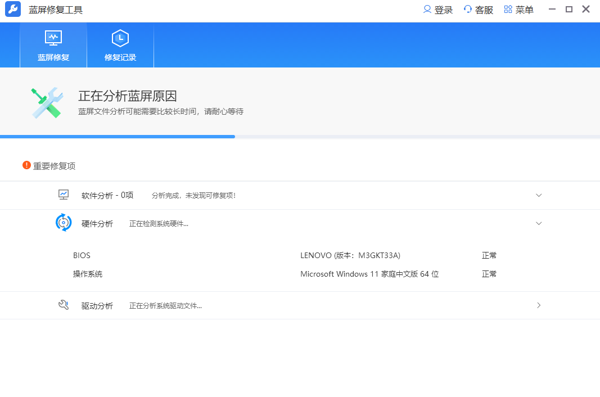 蓝屏修复工具只需启动点击修复按钮,工具会自动分析系统日志、驱动冲突、硬件兼容性等问题,迅速恢复电脑正常运行。